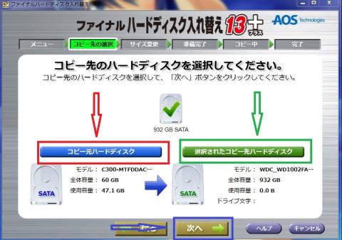 次にコピー先の選択画面が出ますので確認して次クリックし、サイズの変更がなければ