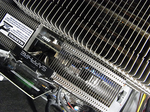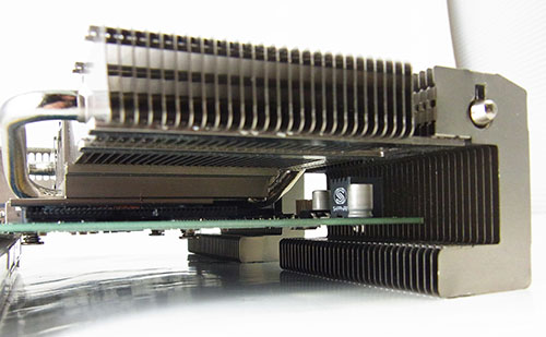 そしてこのSAPPIREモデル。4本のヒートパイプのうち2本が基盤上のヒートシンクに、そして残りの2本がコの字型に基盤サイドから裏面に回りこむあのオーバーハング部分に突き刺さっているという凝ったデザイン。