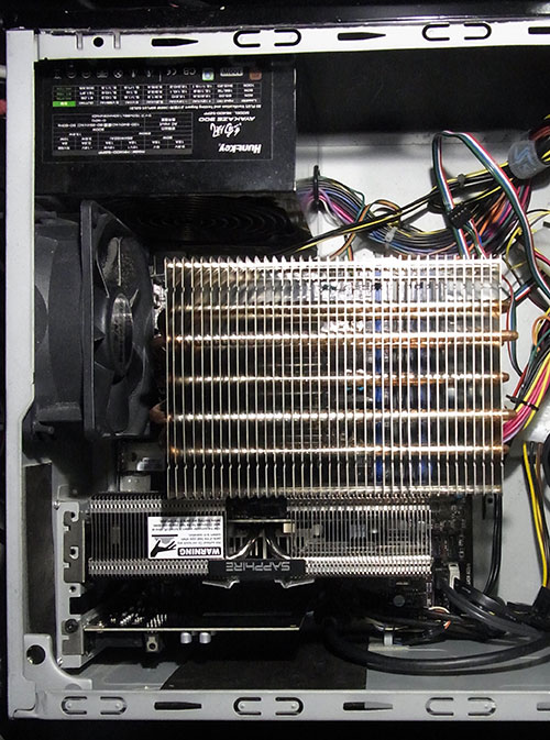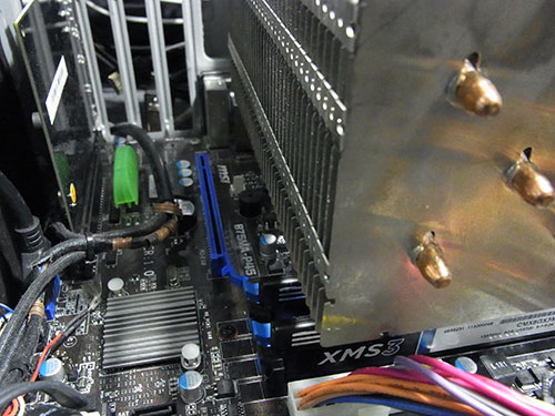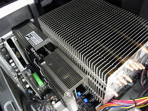 確かにこのバカらしい見た目を狙っていたのは本音だが、いざ実現すると自分で笑いが止まらない。 しかもご覧のとおり両方ファンレス状態。CPU側はXeon E3-1260Lという低TDPモデルなのでオロチはファンレスでも余裕があるが、HD7750と両方から熱がもわもわしたらどうなるか。