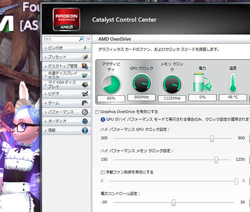 で、早速装着してTERAを1時間程プレイした後の状態。室温は25度と暖かい日だったのだが、48度と50度未満に収まっている。その後も50度前後に収まっていたようだ。ゲームを終了すればあっさりと35度まで低下する。