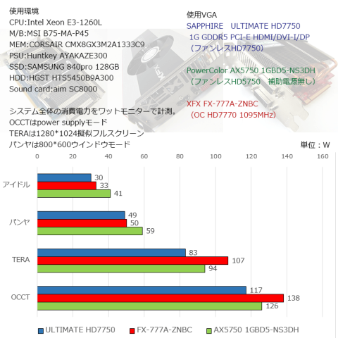 このパンヤというゲーム、CPU負荷が主にかかり、GPU側は軽く動作する程度の低負荷。なのでアイドル時と同じようにHD7770とHD7750がその分消費電力を落とし込み、HD7750のキャパシティを越えるような負荷がかかって初めて両者の消費電力差も出てくるという感じだ。