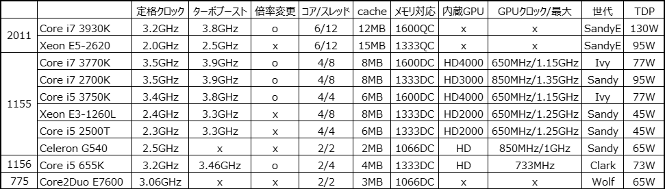 小さいのでクリックで拡大してみてもらう形になるが、最近手持ちで使用したIntelCPUに、以前同じPCで使用していたCore2Duo E7600、更に比較用として3930K&.3770Kのi7コンビも追加した。