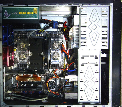 と言うわけでオンボロケースにぶちこみ完了。Pentium4時代から使っているだけあって、今の目で見ると内部スペースや放熱に余裕のあるケースではないが、マザー自体はCPUのでかさとメモリスロット8本のインパクトに反してATXサイズに収まっている。