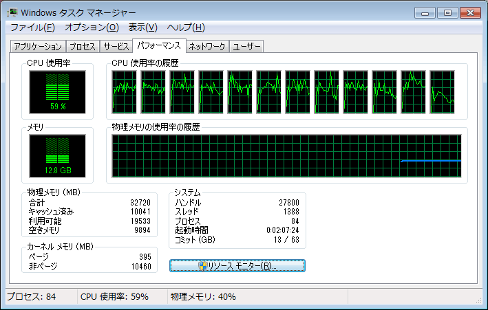 まあそんな事よりこのタスクマネージャをみてくれよ。1260L導入時の8スレッドにも感動したがこの12個並ぶグラフ、タマラナイネ!