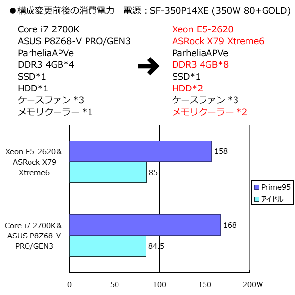 アイドル消費電力は、換装前後で殆ど差は無いように見えるのだが、今回の換装にあわせてバックアップ用HDDを1台にメモリを4枚、光まくるメモリクーラーを1個増設しているので、恐らくE5-2620側に6W程度上乗せされている筈だ。