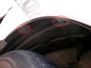 写真のように、タイヤハウス内のカバーを固定してるノックを外して、カバーをめくって行います。