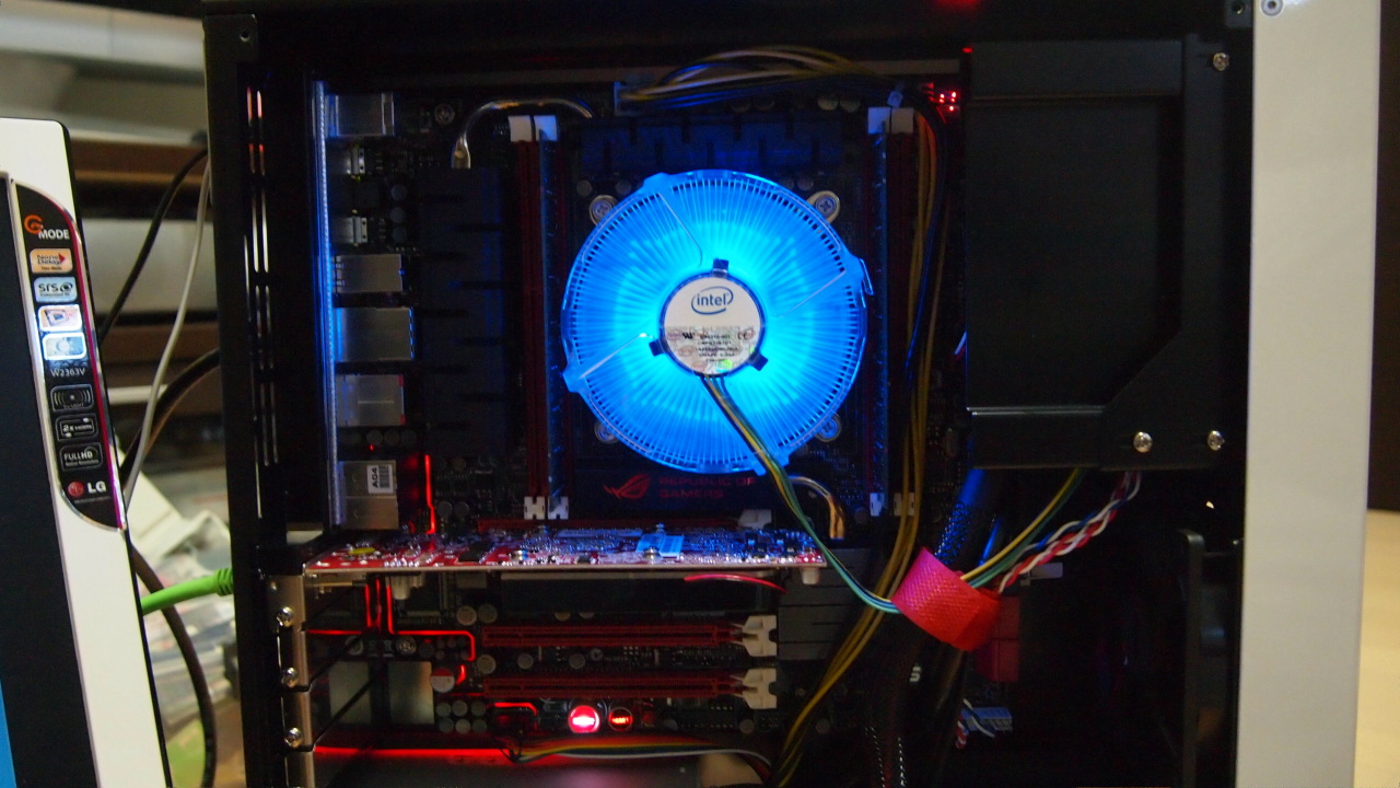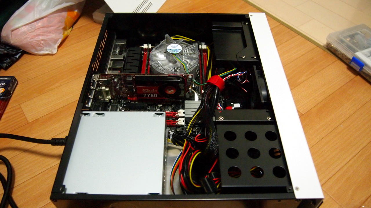 取り付けてみた写真ですが、1155よりCPUが中央よりにあるので、スリム光学ドライブ用のベイにクーラーが干渉しそうです。またCPUの左側のメモリのそばにあるヒートシンクが結構熱くなるので、夏までに何か対策したほうがいいかも。