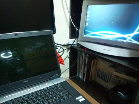 まあ、正面を向くわけではありませんが、この接続だと、机の上のメインマシン、モニターが上に乗っかったサブマシン、そして液晶がライト切れで映らないが、TVに出力しているノートメイン