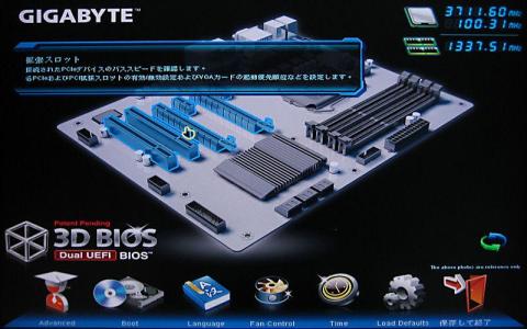 3Dモードとアドバンスモードがあり、3DモードはインタラクティブなGUI画面で分かりやすい操作が可能でアドバンスモードはより広範囲な設定が出来オーバークロッカーやパワーユーザー向けのUEFI環境だそうです。