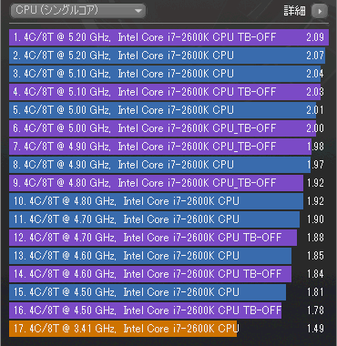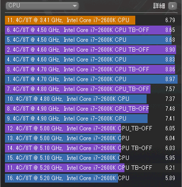 マルチスレッドの「CPU」はピークは4.7GHzで4.8GHzでは1段ダウンして5GHzでさらにダウン!標準の3.4GHzを下回るようになってしまいました。