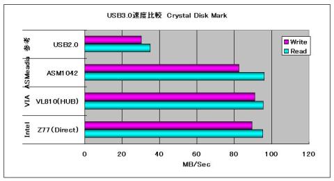 HDDなので,それほどの速度は出ていませんが,Z77も遜色なしです.VL810のHUB経由でも速度低下は見られません.なぜか,Z77チップセットは,Write側が速いようです.