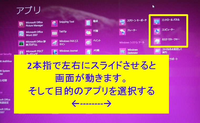 ②2つ目は、検索のしたのアプリをクリックすると、アプリだけの画面になりますので、2本指でスライドさせて、アプリを見つけて選択します。