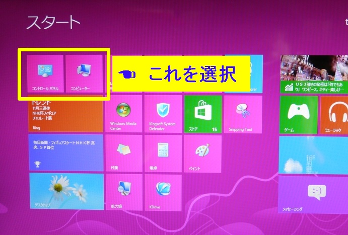 スタート画面から「コントロールパネル」や「コンピューター」とかよく使うものを使おうとすると、Windows8画面にはないんですね。