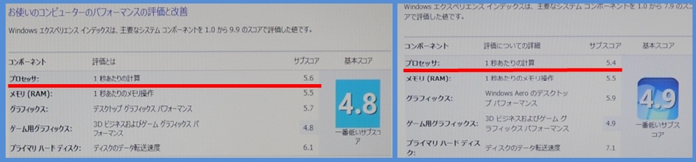 エクスペリエンスインデックスはWindows8では9.9までの評価となりましたね。 Windows7は7.9までなので、同じマシンでも数値が変わりました。