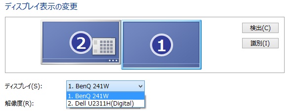 i7-2600Kに16Gメモリ、BenQFP241W(1920*1200)+DellU2311H(1920*1080)というちょっと古めの構成です。