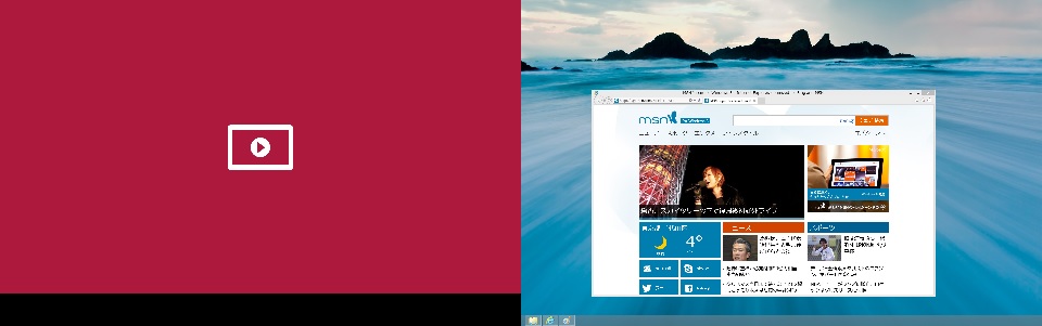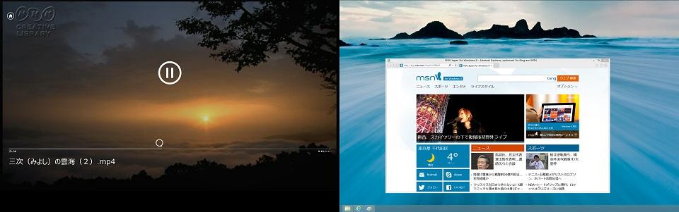 この時左側の画面のほうに、右側にあるIEをドラッグして移動してくると「ビデオ」アプリは自動的に一旦停止してデスクトップが表示されます。一番簡単な中断方法だったりします(w