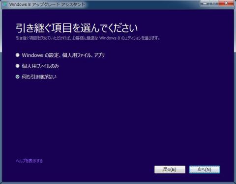 今回は、クリーンインストールを行う予定なので、"何も引き継がない"を選択しました。