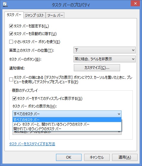 タスクバーについてはどの画面に表示させるかの設定があります。