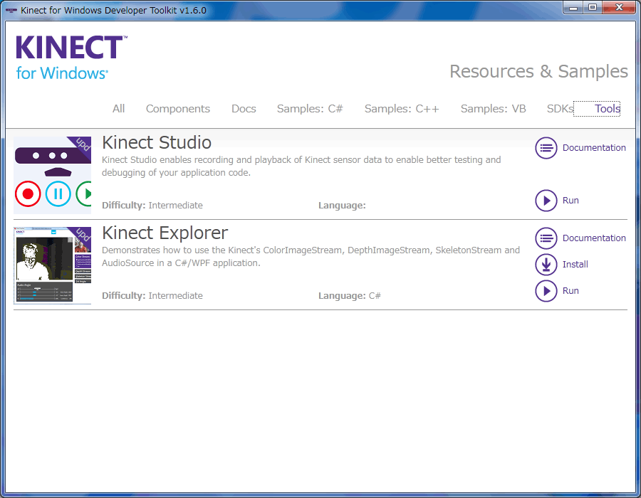 で、動作確認をしたい場合は先のダウンロードページから「Kinect for Windows Developer Toolkit」をダウンロードし、インストール。