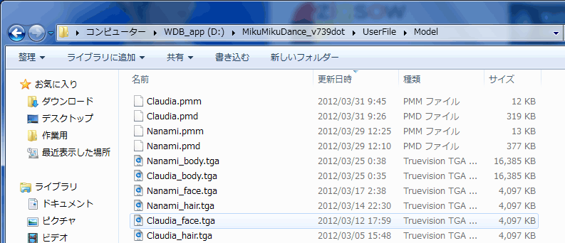 具体的には「MMD_DATA」フォルダ内にある「MMD-Nanami」「MMD-Claudia」フォルダの中のデータ全て(.pmd .pmm .tga*3の5ファイルづつ)をMMDの「UserFile」内「Model」ディレクトリに全部コピペ。ちなみにメディア内にある「3DCG_DATA」はMMD用ではなく3DCGソフト用のものなので今回はスルー。