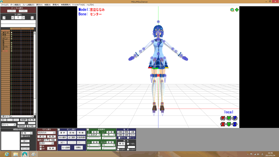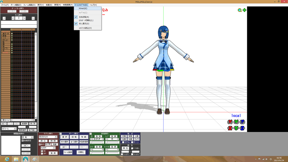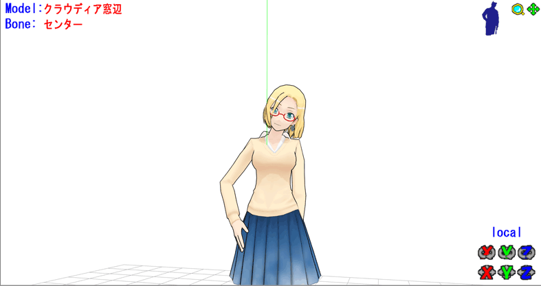 これで読み込み完了。このままだとボーンが選択されていて線が表示されているので、Kinectで動かすだけの今回は選択を解除してしまおう。「モデル操作」の右側にある「ボーン操作」の選択ボタンを押せば選択解除された状態になり、モデリングのみが表示される。