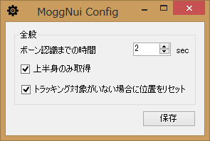 じゃあ今回のMMDを狭い部屋で楽しむにはどうしたらいいか?まずは先ほどのMoggNuiの設定プログラムを起動して「上半身のみを取得」にチェックを入れる。