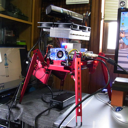 机の上…というかPC2台の上に蜘蛛を置くという恐ろしい状態に。これでセンサーの高さは床から1m20cm程度。これなら使える。