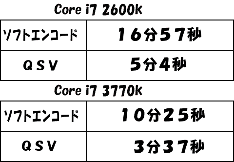 正直かなり大きな速度アップだと思います、クロック差を考えるとソフトエンコードでもチョットびっくり。