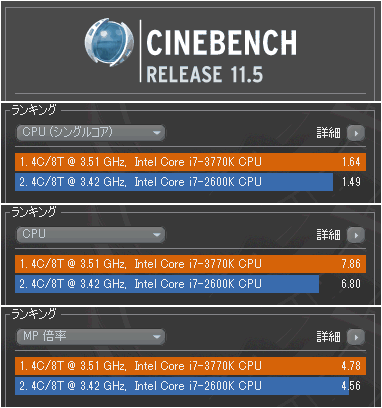 続いてはCINEBENCHの結果です、OpenGLの2600Kの結果を取り忘れていたのではしょります。