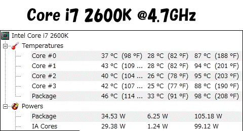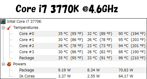 Core #0~#3まででは2600Kは「87度~95度」、3770Kが「88度~95度」と拮抗しています、4コアの平均でも差は1度以内。