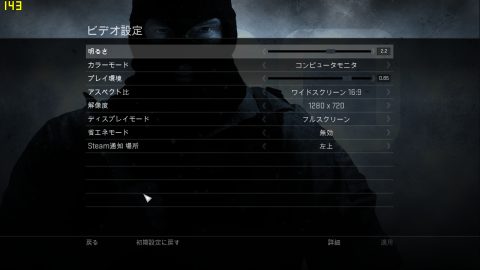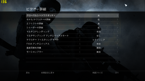 マップや状況によって重く感じることもありますが、このままでも普通に遊べますね。シビアなFPSはできるだけ軽い方がいいと思うので設定を下げてみます。