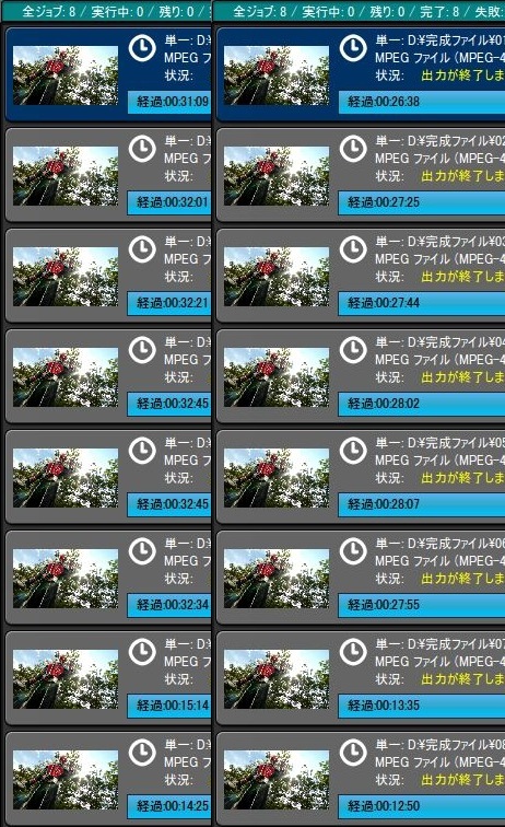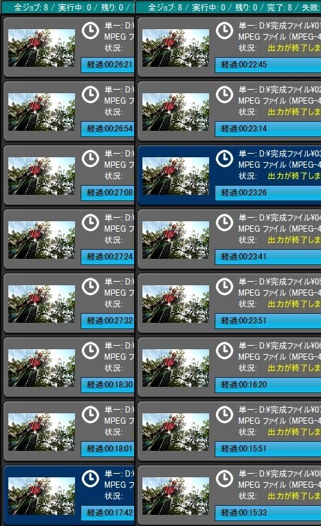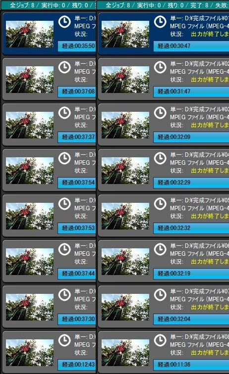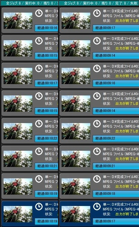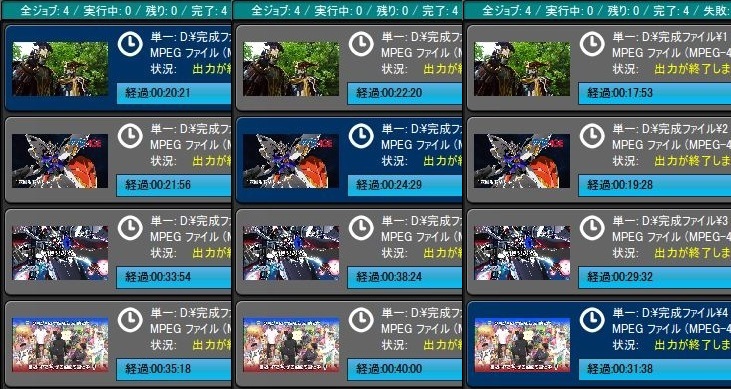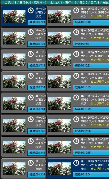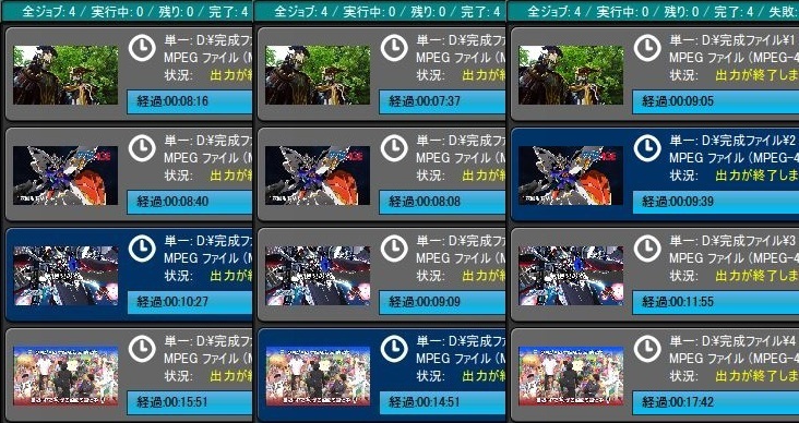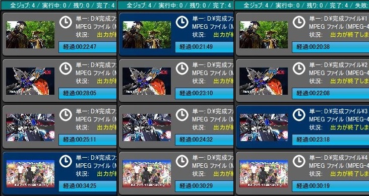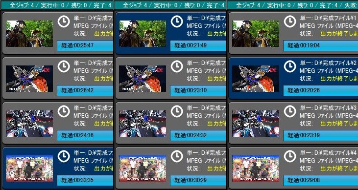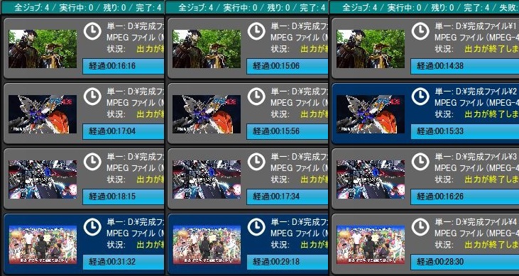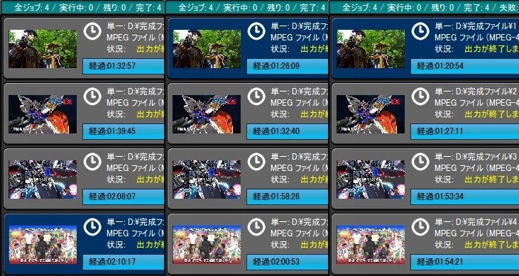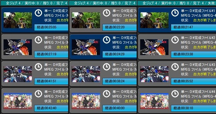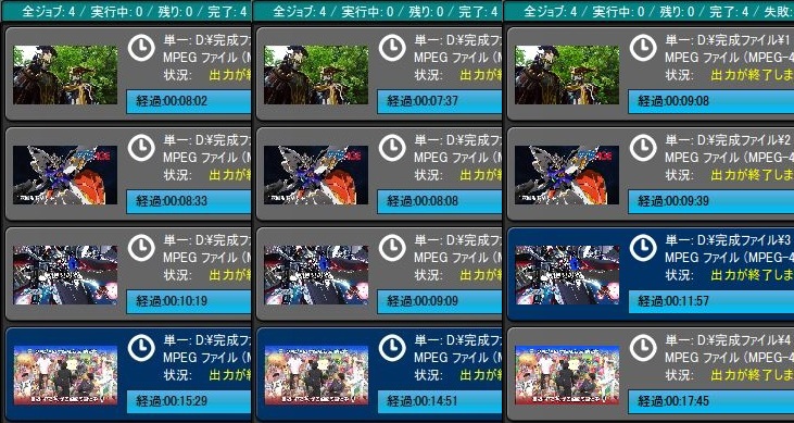 完了までの時間でいうと、かなり高速に処理が終わっています。「30分の特撮もの」を8本エンコードして40分そこそこです。これ、かなりすごいことだと思います。