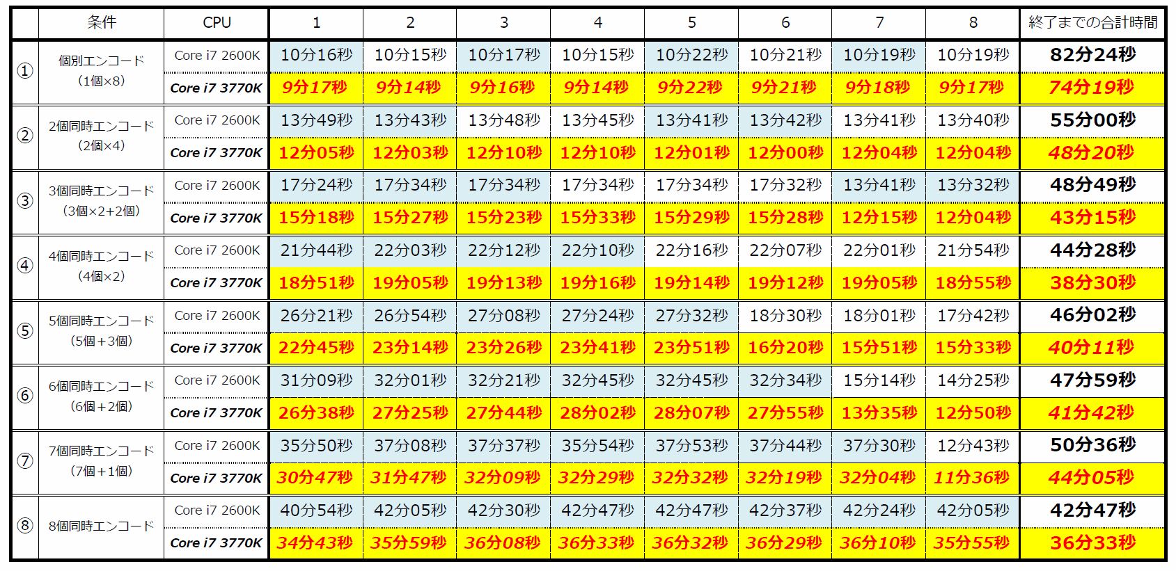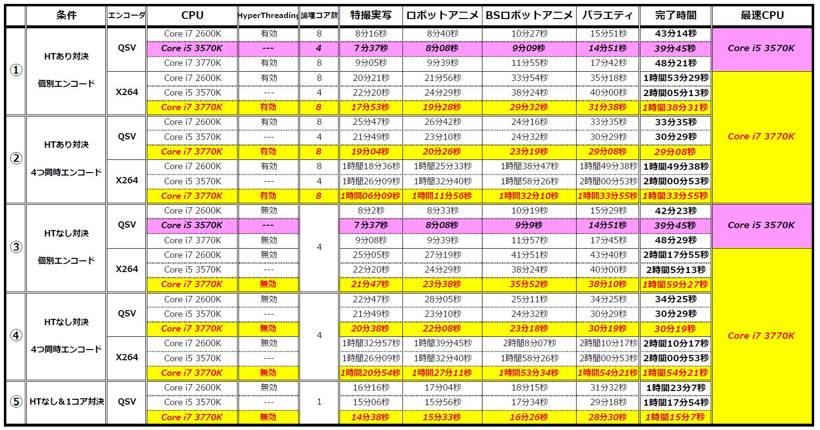 ①Core i7 2600K HyperThreading有効 vs Core i5 3570K の個別エンコード