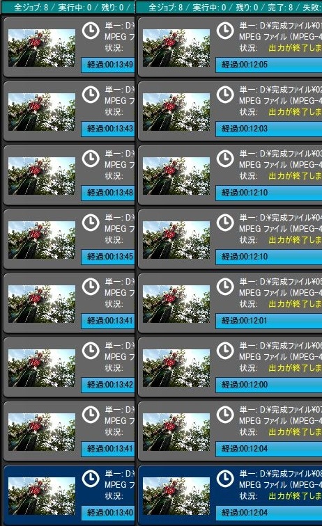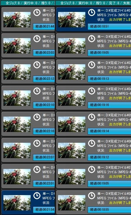 両者の「差」でいうとさきほどよりは縮まってますが、2本ずつを同時に進めることで最終的に8本のファイルをエンコードする時間はかなり短縮されています。