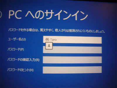 サインイン(ログオンから名前が変わった)、何時もの「ユーザー名」、「パスワード」、「パスワードの再入力」、「パスワードのヒント」を入力して、「終了」ボタンをクリックして終了です。