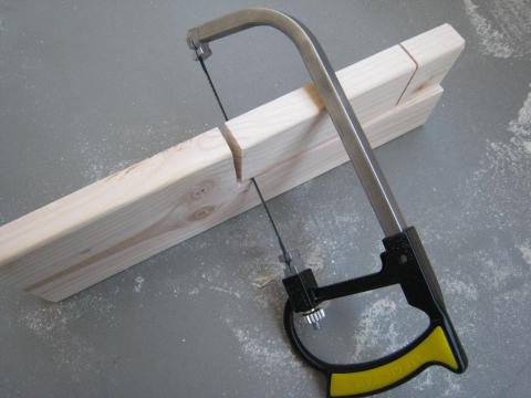 30cmを3枚接着したキューブ型にするので、ボンドで3枚を接着した基本形にのこを入れます