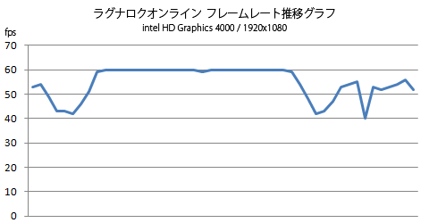土曜日のプロンテラの街道沿いに並ぶ露店の列を、南門から噴水まで往復した際の平均fpsは54.9fpsであり、最低42fps、最高60fpsとゲームをプレーするには十分のスペックです。