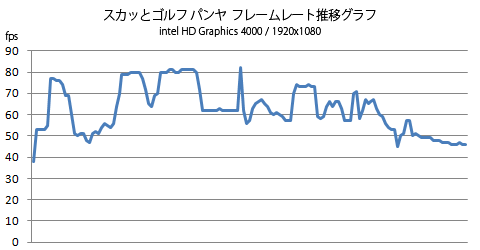 画面設定を最も高負荷な状態にセットして2ホールほどプレーしたところ、最高81fps、最低38fps、平均で62.4fpsという数値を叩き出しました。