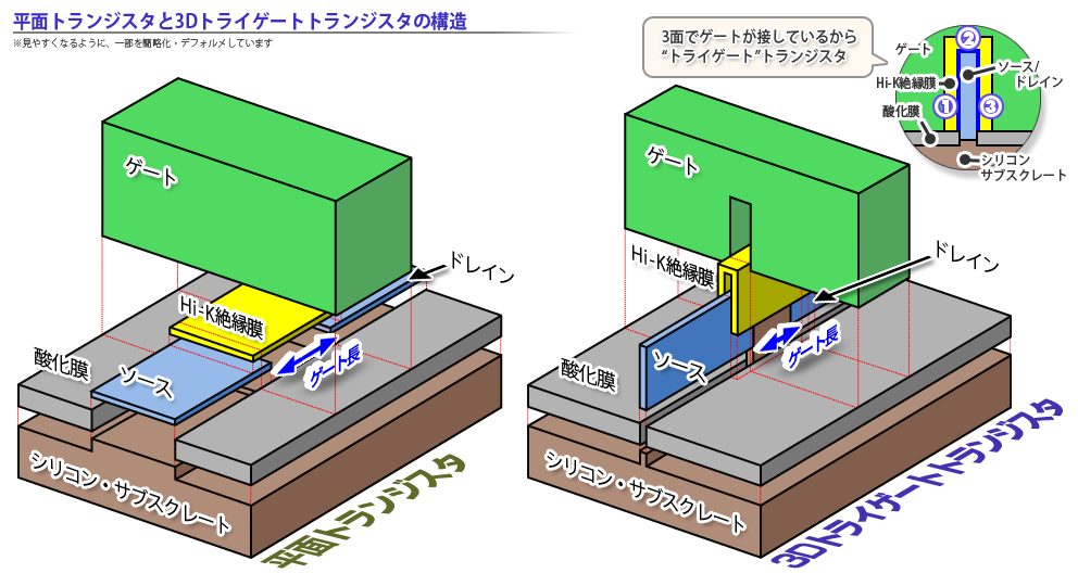 平面トランジスタでは文字通り平面で接していますが、トライゲートトランジスタはゲートが3面で接していることが「トライゲート」と呼ばれている所以となります。