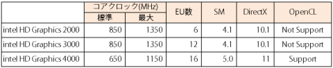 最大の違いは、EU数がHD 3000の12から16へ拡張されたことと、DirectX 11のサポート、OpenCLのサポートでしょうか。