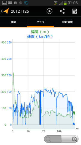 グラフを表示してみます。標高・速度が出ますね。