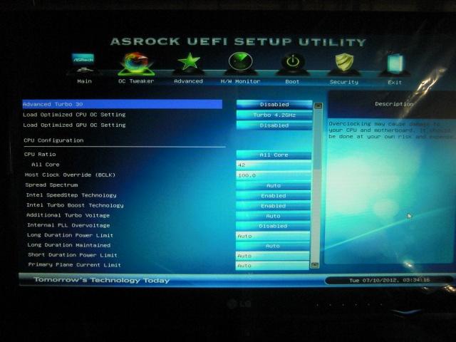 OCですが、慣れてないUEFIですので手動はやめてM/Bの簡単OCで設定しました。