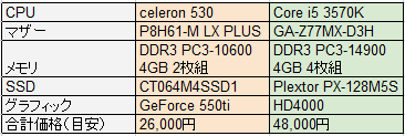 まずはじめに、比較対象となるPCと今回(i5)をのせたPCの構成です。