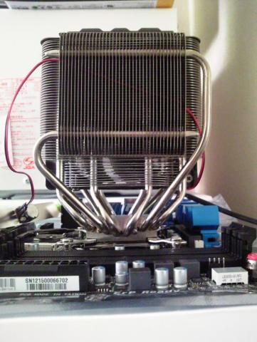 GA-Z77X-UD5Hに乗せたところ。ヒートパイプがCPU付近ですぐに曲がっているので、マザーボードのヒートシンクには意外と干渉しなかったりします。