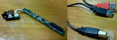 スリムATAPIドライブのお尻に密着するような基盤とそこから別れているUSB Bコネクタと補助電源用と思われるACアダプタ用コネクタの乗った基盤、USB-USB Bケーブル これも信号用の1本とは別に給電専用の赤色端子がある二股タイプのものが付属。