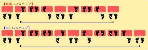 左右の脚を均等にするには、【正しいステップ】のように台の上か床で1回足踏みをします。