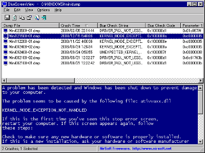 BlueScreenView v1.45 - View BSOD (blue screen) crash information stored in dump files. Copyright (c) 2009 - 2011 Nir Sofer