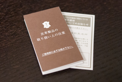 皮革製品の取り扱いに関する注意書きも同梱されていました。