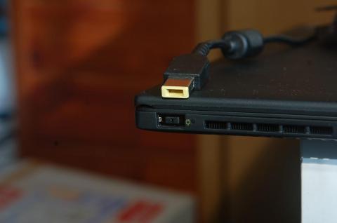 X1 Carbonに備えられているポートは、USBが左右1つずつに、ディスプレイポート、3.5mmステレオ・マイク、SIM、SDが1つづつという、HDMIが無い以外はウルトラブックとしては標準的なものですが、Macに触発されたのか電源コネクタが四角のものになっています。この電源コネクタは上下の向きを気にせずに挿せるという触れ込みなのですが、そもそも以前の丸型のコネクタなら、何も気にする事は無いのに、と思ってしまいます。