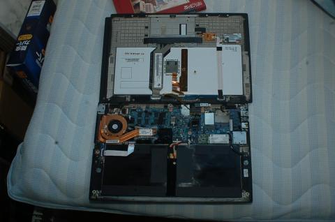 パームレストを外したところです。剛性を高めるためなのか、裏面に開口部は無く、パームレストを外さないと内部にはアクセスできません。見ての通り、バッテリーが半分以上の面積を占めています。